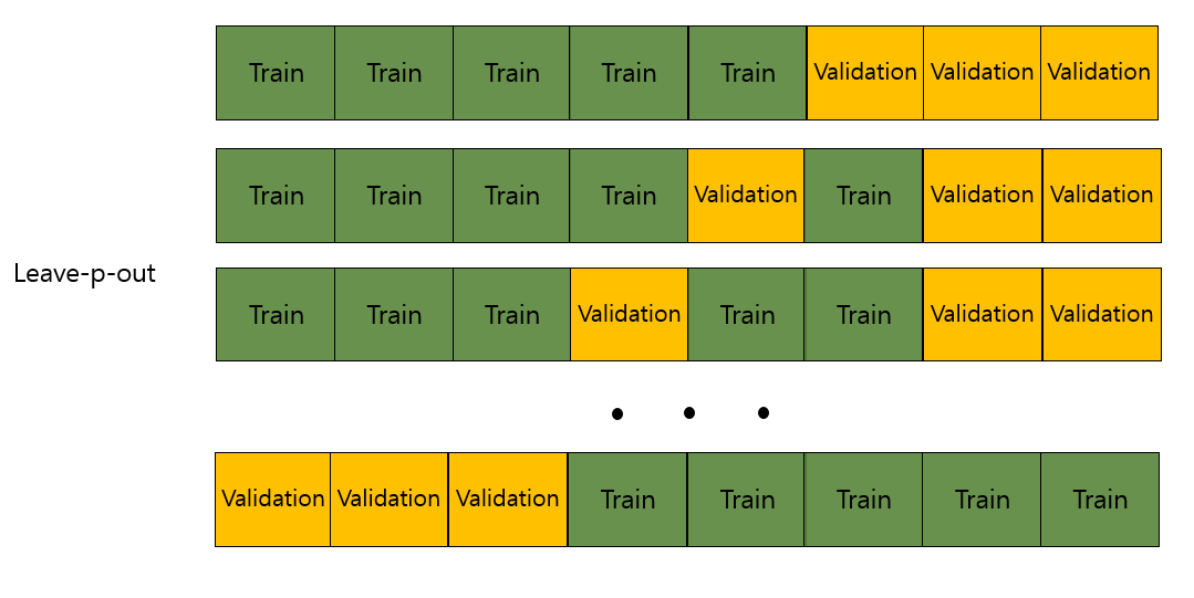 리브-p-아웃 교차 검증(Leave-p-out Cross Validation)은 가지고 있는 데이터셋에서 p개의 데이터를 추출하고 남은 데이터를 validation data로 사용하는 방법입니다. 예를 들어 리브-3-아웃 교차검증은 가지고 있는 데이터에서 아래의 그림처럼 3개를 추출하여 train data로 이용합니다. 그리고 나머지 데이터는 validation data로 사용하여 검증 결과를 도출합니다. 이 방법 또한 계산 시간이 오래 걸린다는 단점이 있습니다.