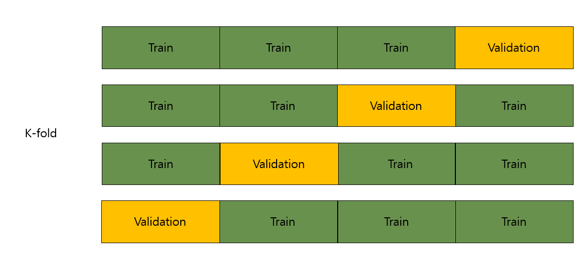 K-겹 교차 검증(K-fold Cross Validation)은 가지고 있는 데이터를 K개의 그룹으로 나누어 그 그룹 중에서 하나를 추출하여 validation set으로 사용하는 것입니다. 그리고 이 과정을 K번 반복하여 나온 결과값을 평균내어 검증 결과 값으로 사용합니다.