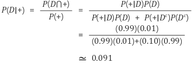 - 병에 걸린 사람이 양성 : P(+|D) = 0.99