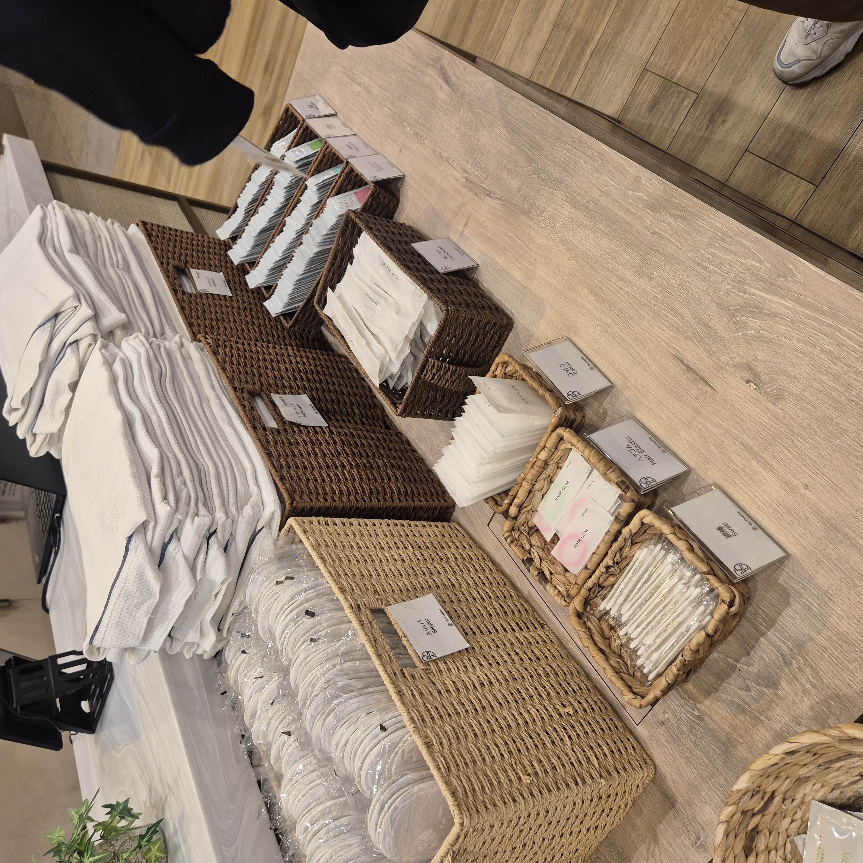 1층에는 수건, 슬리퍼, 면봉 등등 자유롭게 가져갈수있도록 쭈욱 진열되어있었다