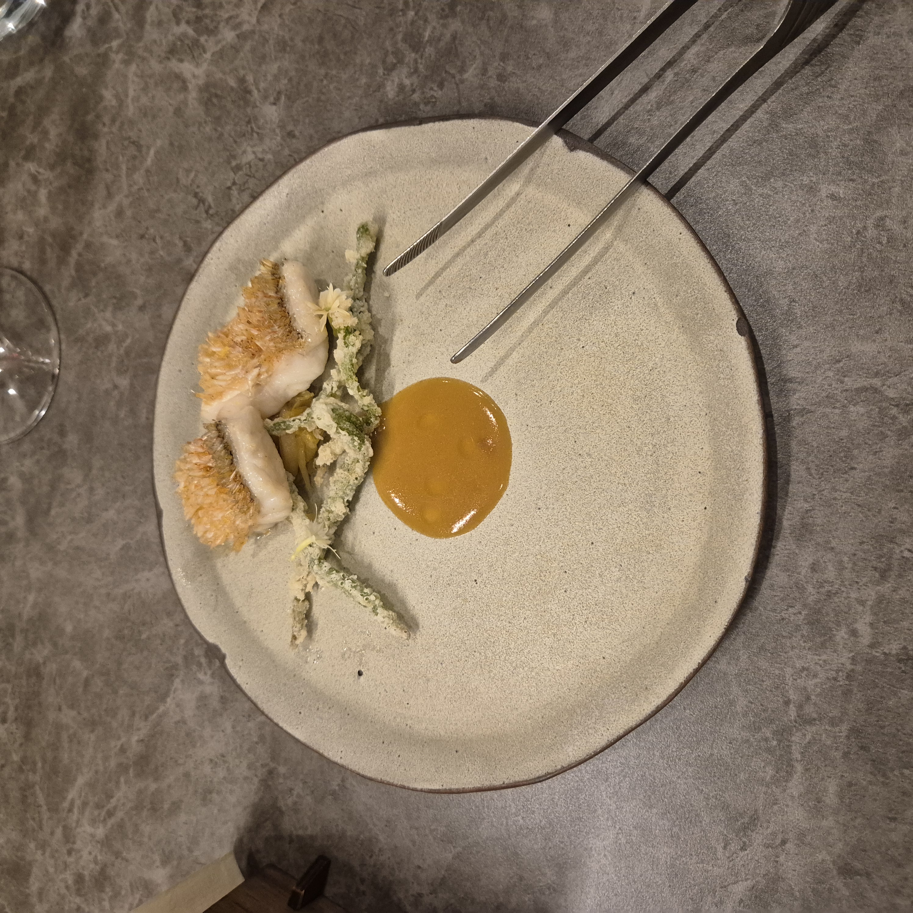 방어, 성게알, 거품과 아래 깔린 소스를 숟가락으로 한꺼번에 떠서 먹으면 됩니다